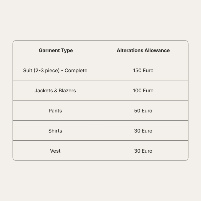 Please note if you’re co-ordinating having your garments altered by your own tailor, you’re covered with Saint Daniel store credit up to the limits displayed here. If you’re quoted above these limits by your alterations tailor, please get in touch with your stylist as we may prefer to remake your garment or recommend a more competitive alterations expert.
